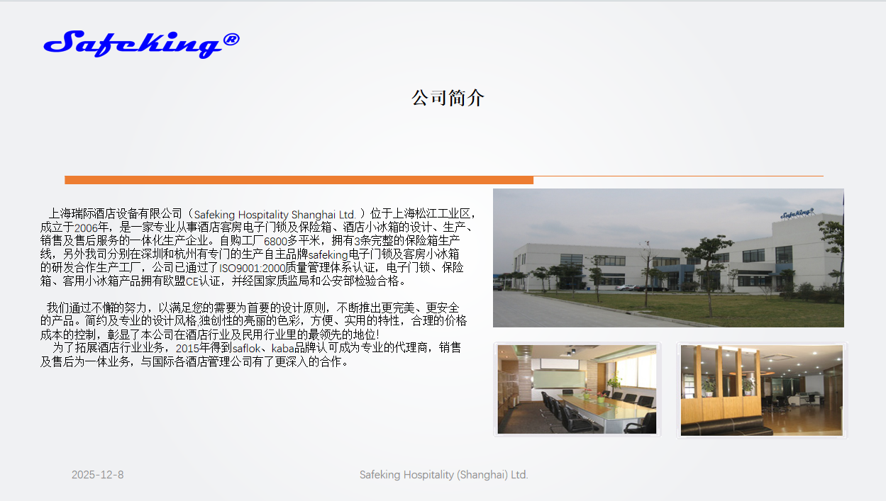 上海瑞际酒店设备有限公司(Safeking Hospitality Shanghai Ltd. )位于上海松江工业区,成立于2006年,是一家专业从事酒店客房电子门锁及保险箱、酒店小冰箱的设计、生产、销售及售后服务的一体化生产企业。自购工厂6800多平米,拥有3条完整的保险箱生产线,另外我司分别在深圳和杭州有专门的生产自主品牌safeking电子门锁及客房小冰箱的研发合作生产工厂,公司已通过了ISO9001:2000质量管理体系认证,电子门锁、保险箱、客用小冰箱产品拥有欧盟CE认证,并经国家质监局和公安部检验合格。