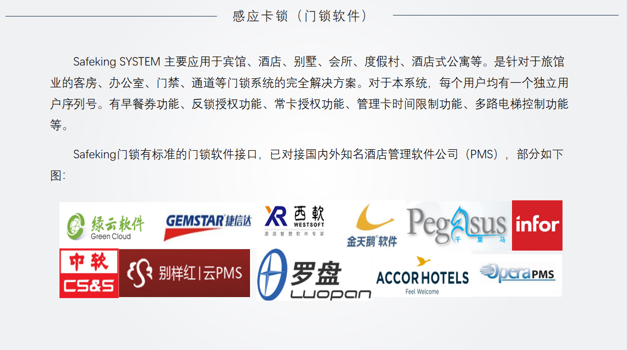 多年来一直致力于公司自主品牌“Safeking”智能门锁及相关产品的研制、制造、销售,品质优良,客户遍及全球40多个国家、地区,深受用户青睐。 公司拥有自主进出口权,通过ISO9000质量保证体系认证,是我国智能门锁行业拥有全部核心技术和自主知识产权的少数厂家之一,是行业内拥有强大的开发能力的少数公司之一。