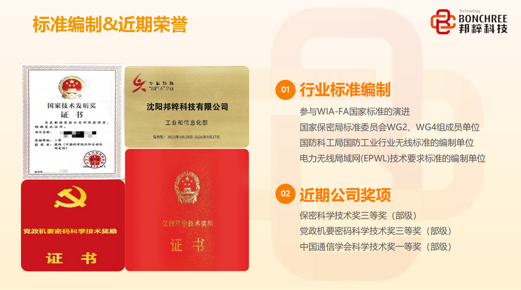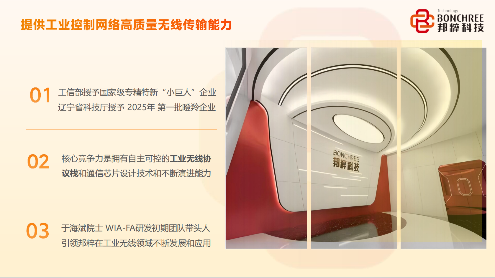 沈阳邦粹科技有限公司成立于沈阳,是国内领先的 工业控制网络无线通信企业,以 WIA-FA 工业无线通信技术为核心,自主掌握全国产协议栈、通信芯片设计与演进能力,是国家级专精特新“小巨人”企业、辽宁省瞪羚企业。